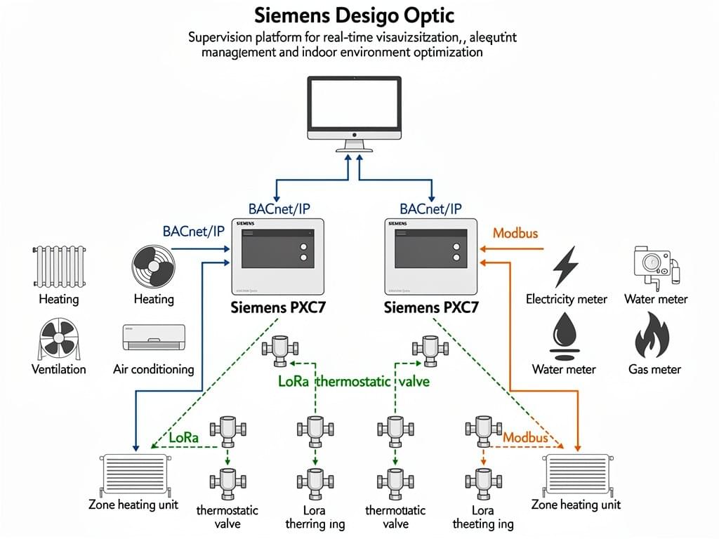 Réduisez vos coûts énergétiques et garantissez la conformité de votre bâtiment avec notre solution GTB clé en main. Grâce aux automates Siemens PXC7 et à une supervision Desigo Optic, nous optimisons la production de chaleur, de froid et la ventilation, tout en assurant un suivi précis des consommations via des vannes connectées LoRa.